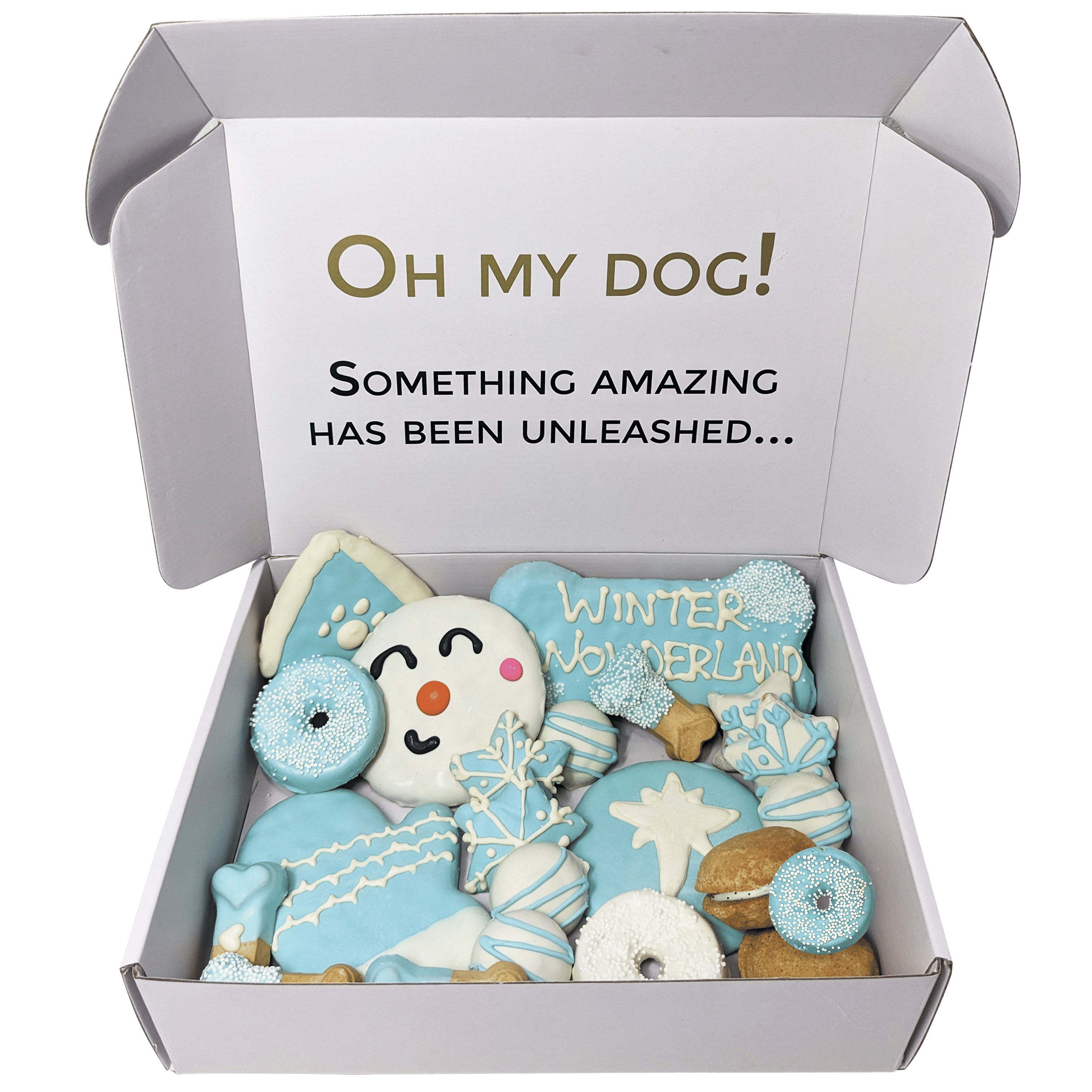 Includes 21 themed treats including snowman & snowflakes treats, winter biscuits, and dog macarons