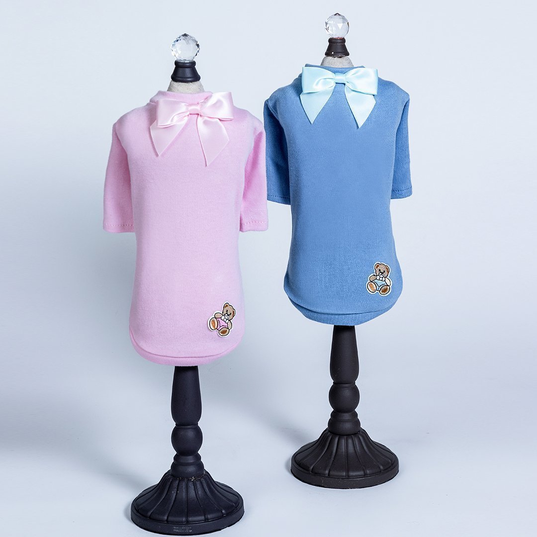 Dress your pup in this Baby Bear Tee handmade by Hello Doggie for the cutest look ever, perfect for your adorable little pup to go anywhere! Made with cotton jersey knit  soft fabric.Wash on gentle cycle in cold water, no bleach or softner and air dry or tumble on low. Sizes - XXS - LG MSRP - $ 42.00  *Tee is handmade and sizes may vary slightly. Made in USA.