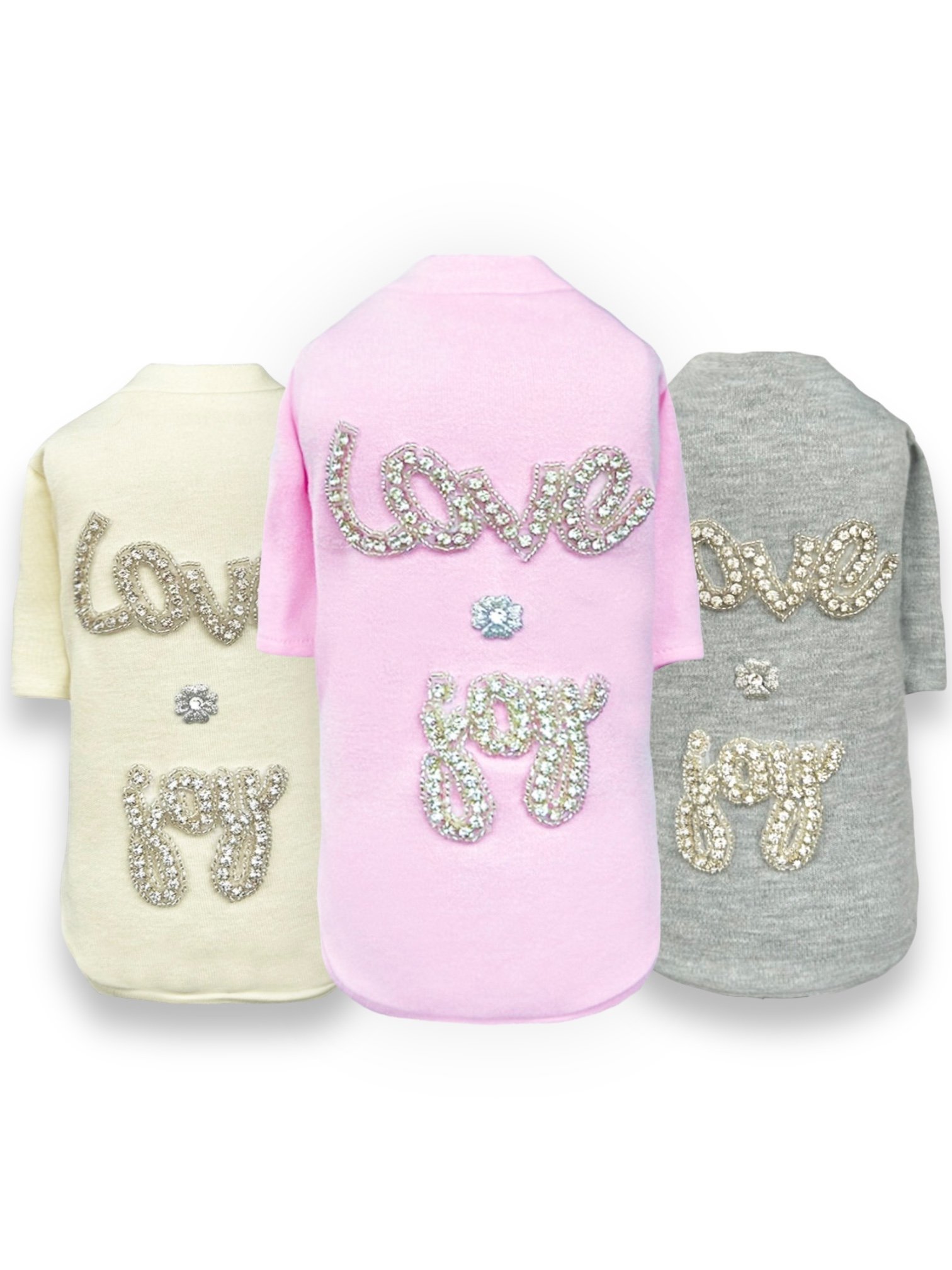 Treat your four-legged companion to the Love and Joy Dog Tee by Hello Doggie, and let them strut their stuff with comfort and style. Made from 100%  cotton Jersey knit textile, this tee provides a soft and breathable , perfect for all-day wear. The love and joy appliqués on the tee add a touch of charm and elegance to your baby’s outfit, featuring a stunning silver flower design embellished with a sparkling Swarovski Crystal, creating a luxurious look. For a brand new look  every time, turn inside out spot clean or wash on delicate, no bleach or softener and air dry. Sizes   |  XS - LG  MSRP  |  $36.00  *Tees are handmade and sizes may vary slightly. Made in USA.