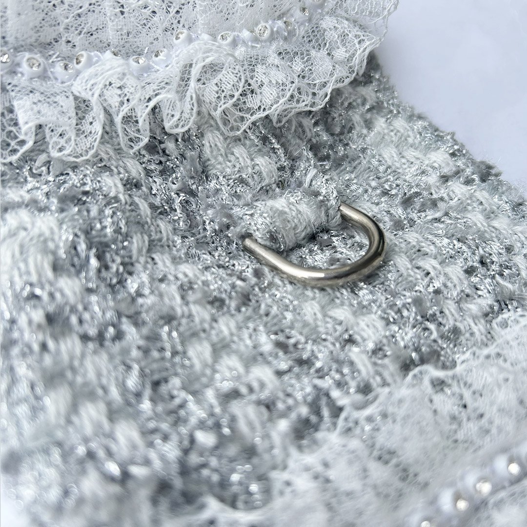 Elevate your pet’s style with our Envogue Dog Harness Collection by Hello Doggie. Each harness is thoughtfully designed, ensuring every baby receives the royal treatment they deserve. From the very selection of fabrics to the intricate piecing together of each harness, no detail is spared in creating these masterpieces. One of the standout features of our luxury dog harnesses is each one has their own unique lace trimming, with a range of classic and trendy styles to choose from, you can find the perfect style to suit your pup's personality and meet their fashion needs. It's not always that luxury items are comfortable, but Hello Doggie prioritizes on comfort and functionality of our harnesses. Thoughtful features such as Velcro straps are easy-to-use fasteners making it a breeze to put on and take off, ensuring a hassle-free experience for both you and your furry baby. When it comes to caring for your luxury dog harness, our high standards extend beyond its creation, to keep the coat looking its best so that your pup can continue to strut their stuff in style, spot clean or wash on delicate, no bleach or softener and air dry. Not only can you elevate your baby’s wardrobe all year round, matching coats for those cold chilly days are also available, sold separately.  *Check Size Chart*  Limited Edition  MSRP $84.00  *Harnesses are handmade sizes may vary slightly. Made in USA.