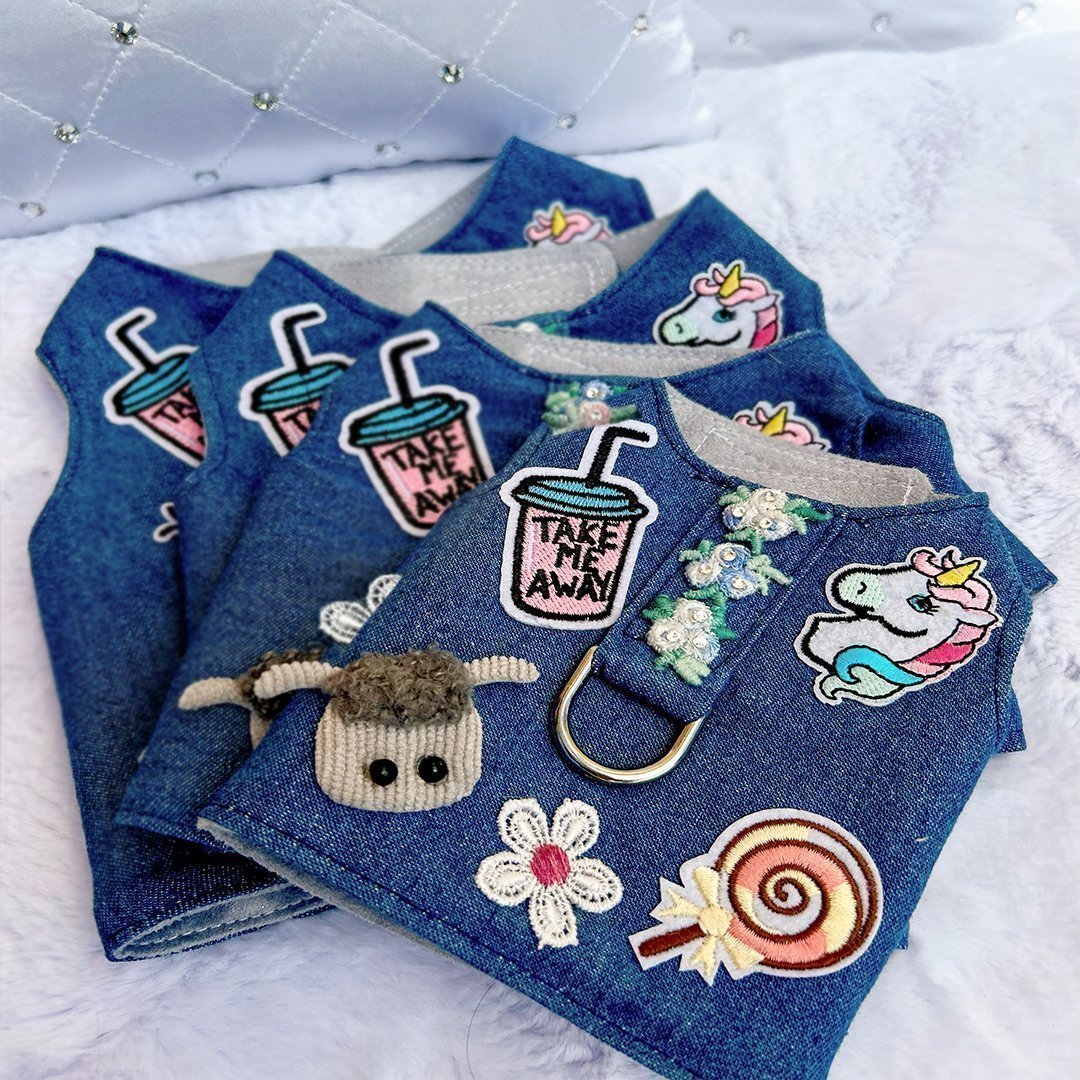 Introducing the stylish and functional Cool Pup Dog Harness by Hello Doggie! Crafted from denim fabric and luxuriously lined with micro suede, this harness is designed to provide both comfort and durability for your furry companion. The inclusion of a secure d-ring allows for tether attachment, ensuring your baby's safety during walks or outings. Thanks to the convenient Velcro straps, this harness is not only secure but also easy to put on and take off. The decorative patchwork and three flowers, available in blue or pink, add a touch of charm to the design, each adorned by genuine Swarovski crystals for a hint of sparkle. Treat your pup to the ultimate combination of fashion and practicality with the Cool Pup Dog Harness - a must-have accessory for every stylish pet parent and their cool pup! Wash in cool on gentle cycle, no bleach or softener and air dry or tumble on low. LIMITED EDITION Sizes | XS - LG  MSRP | $64.00
